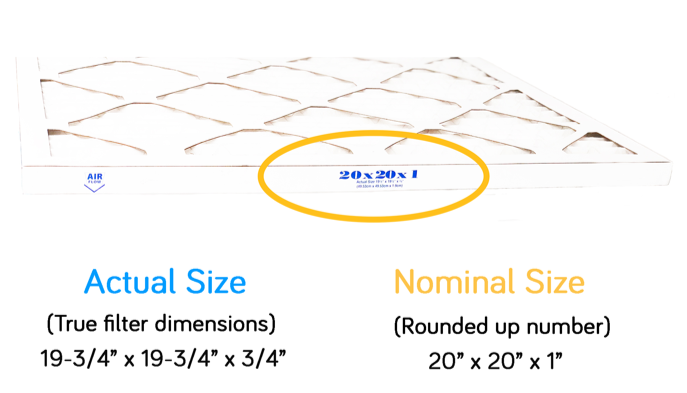 On the side of your current air filter, you may notice two different measurements, the actual size and what manufacturers call the nominal size. Always use the nominal size as shown.